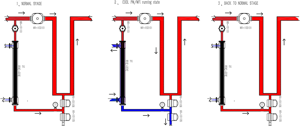 ফার্মাসিউটিক্যাল শিল্পে কঠোর FDA, USP ASME BPE, এবং GMP প্রবিধানের সাথে সঙ্গতিপূর্ণ। যখন সিস্টেমটি কাজ করছে না, তখন প্রধান সঞ্চালনের গরম জল বেশিরভাগ কাজের শর্ত পূরণের জন্য ক্রমাগত জীবাণুমুক্ত করা যেতে পারে এবং একাধিক প্রক্রিয়া বিকল্প উপলব্ধ রয়েছে।